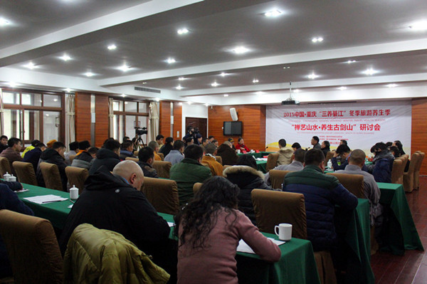 12月18—19日,“禪藝山水·養(yǎng)生古劍山”研討會及系列活動在重慶綦江古劍山禪藝山水養(yǎng)生度假區(qū)隆重舉辦。市政協(xié)部分老領導、綦江區(qū)主要領導、重慶各大寺院方丈住持、各大院校專家教授、民間養(yǎng)生專家、各界企業(yè)家代表及部分養(yǎng)生愛好者參加了相關(guān)活動。研討會特別邀請市佛教協(xié)會會長、梁平雙桂堂方丈身振大和尚到會主持古劍山凈音寺祈福大法會。院長李永明受身振法師邀請,同期到會考察,并與身振法師就弘揚佛法、如何將禪宗禪修與養(yǎng)生旅游相結(jié)合等話題進行專門晤談。