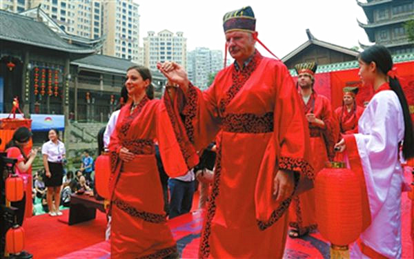 在南溪古街,由12名歐洲熊貓粉絲傾情演繹的漢式集體婚禮成為線路考察中的一大亮點。在悠揚的誦讀聲中,身著漢式服裝的“新人”依次入場,禮道兩旁的侍女持宮燈引導(dǎo),新人行拜堂、沃盥、對席、同牢、合巹、結(jié)發(fā)、執(zhí)手禮,整套漢式婚禮禮儀逐一演繹,讓習(xí)慣了婚紗禮服的老外們親身感受了一番中國傳統(tǒng)婚俗文化。在這里,與會嘉賓們還實地參觀了著名小吃“南溪豆干”的制作流程,欣賞了極具當(dāng)?shù)靥厣墓艠繁硌荨?