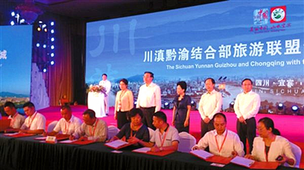 開幕式剛剛結(jié)束,川滇黔渝結(jié)合部旅游聯(lián)盟推介會暨旅游產(chǎn)業(yè)項目簽約儀式就成為各方關(guān)注的焦點。四川省宜賓、瀘州、自貢、內(nèi)江,貴州省遵義、畢節(jié),云南省昭通,重慶市江津區(qū)等8個市(區(qū))旅游部門的代表向參會嘉賓介紹了各自的旅游資源和旅游產(chǎn)品。